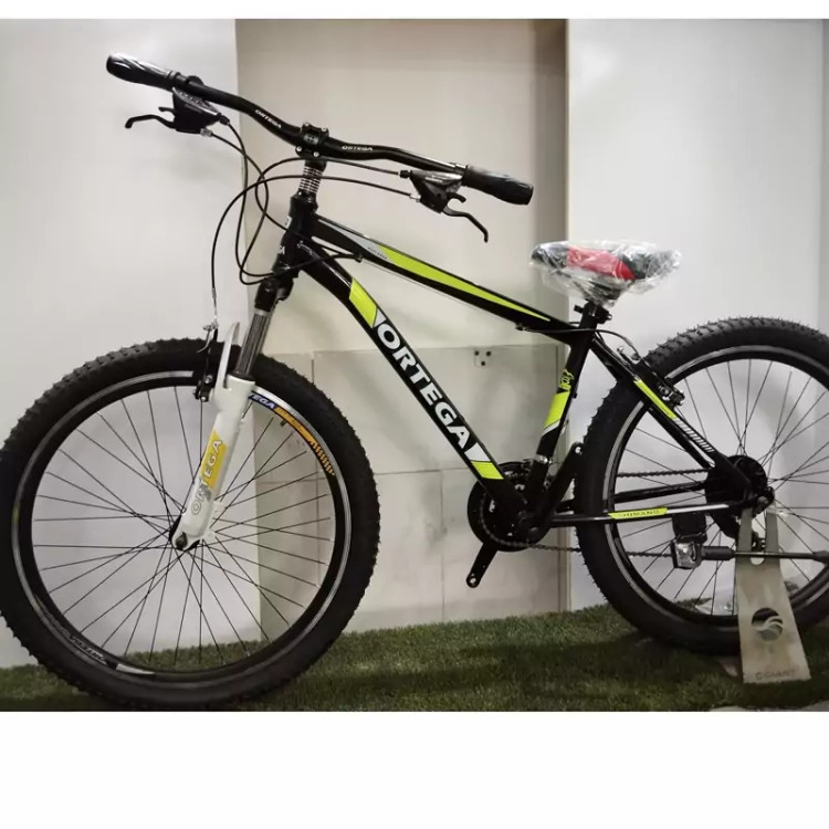 دوچرخه کوهستان برند Ortega مدل explorer سایز 26 سایز تنه مدیوم سیستم دنده 21 سرعته شیمانو خورده دوشاخ جلو کمک فنر دار قفل کن دار تنظیمی سیستم ترمز ویبرک طوقه آلمینیوم دوجداره مثلثی لاستیک پهن 2.40 خارجی دست دنده کلاج دار