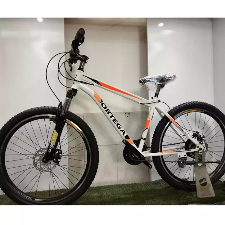 دوچرخه کوهستان برند Ortega مدل explorer سایز 26 سایز تنه مدیوم سیستم دنده 21 سرعته شیمانو خورده دوشاخ جلو کمک فنر دار قفل کن دار تنظیمی سیستم ترمز دیسکی طوقه آلمینیوم دوجداره مثلثی لاستیک پهن 2.40 خارجی دست دنده کلاج دار