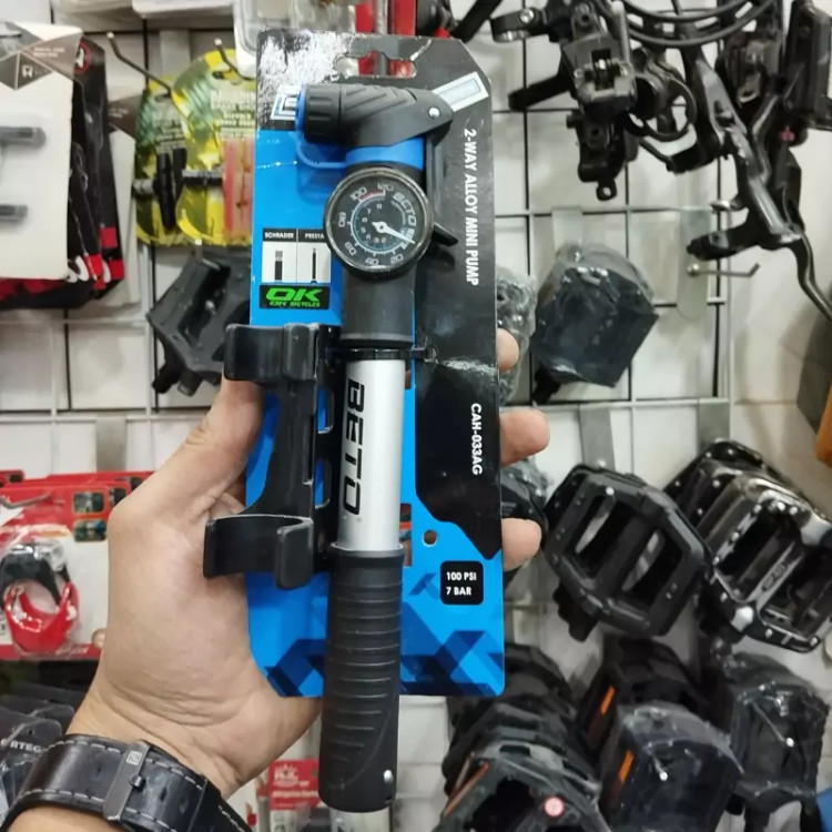 مینی تلمبه همراه دوچرخه برند BETO قابل نصب بر روی دوچرخه گیج دار توان باد 100 psi حالت باد 2-way ساپورت والف موتوری و فرانسوی